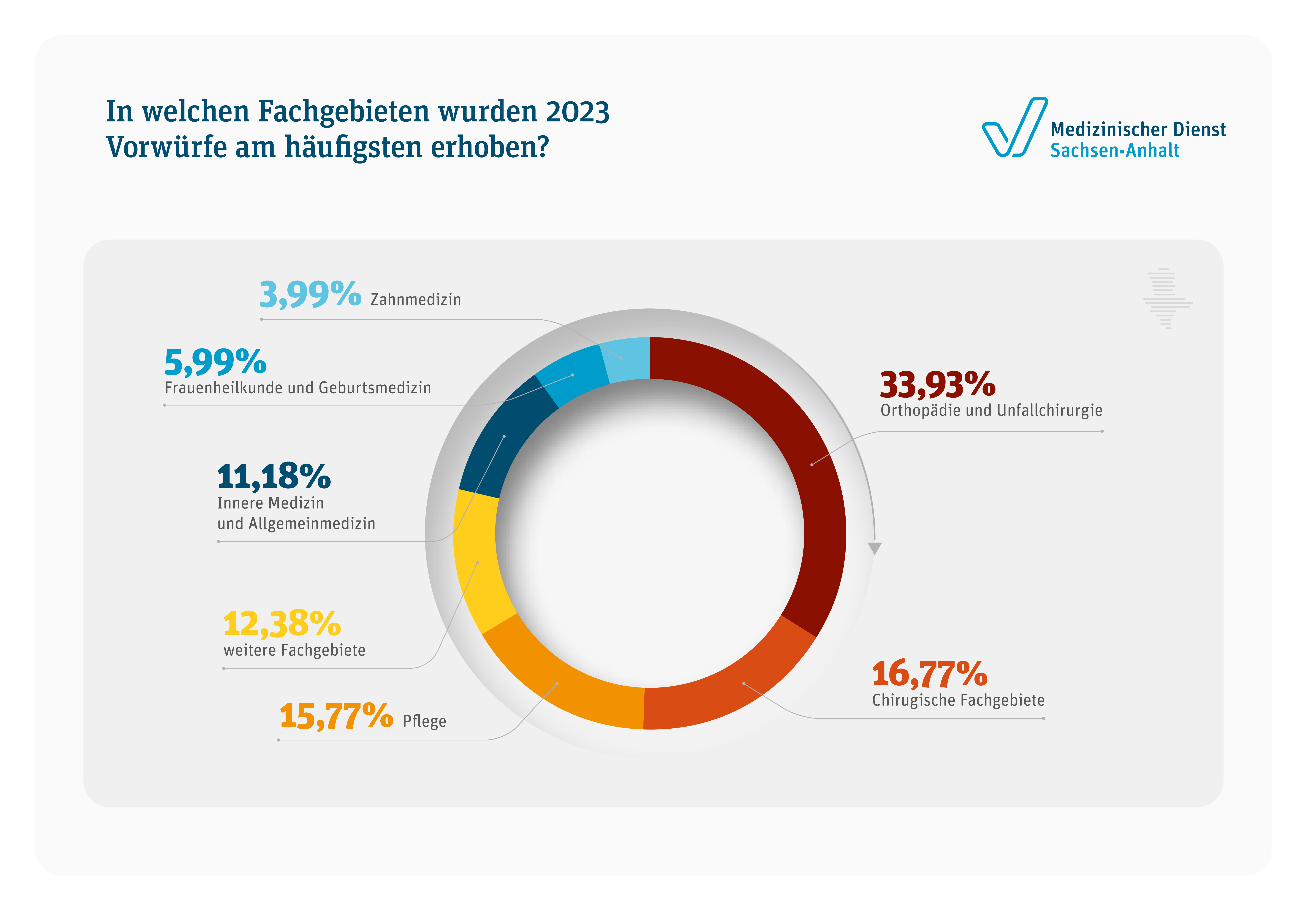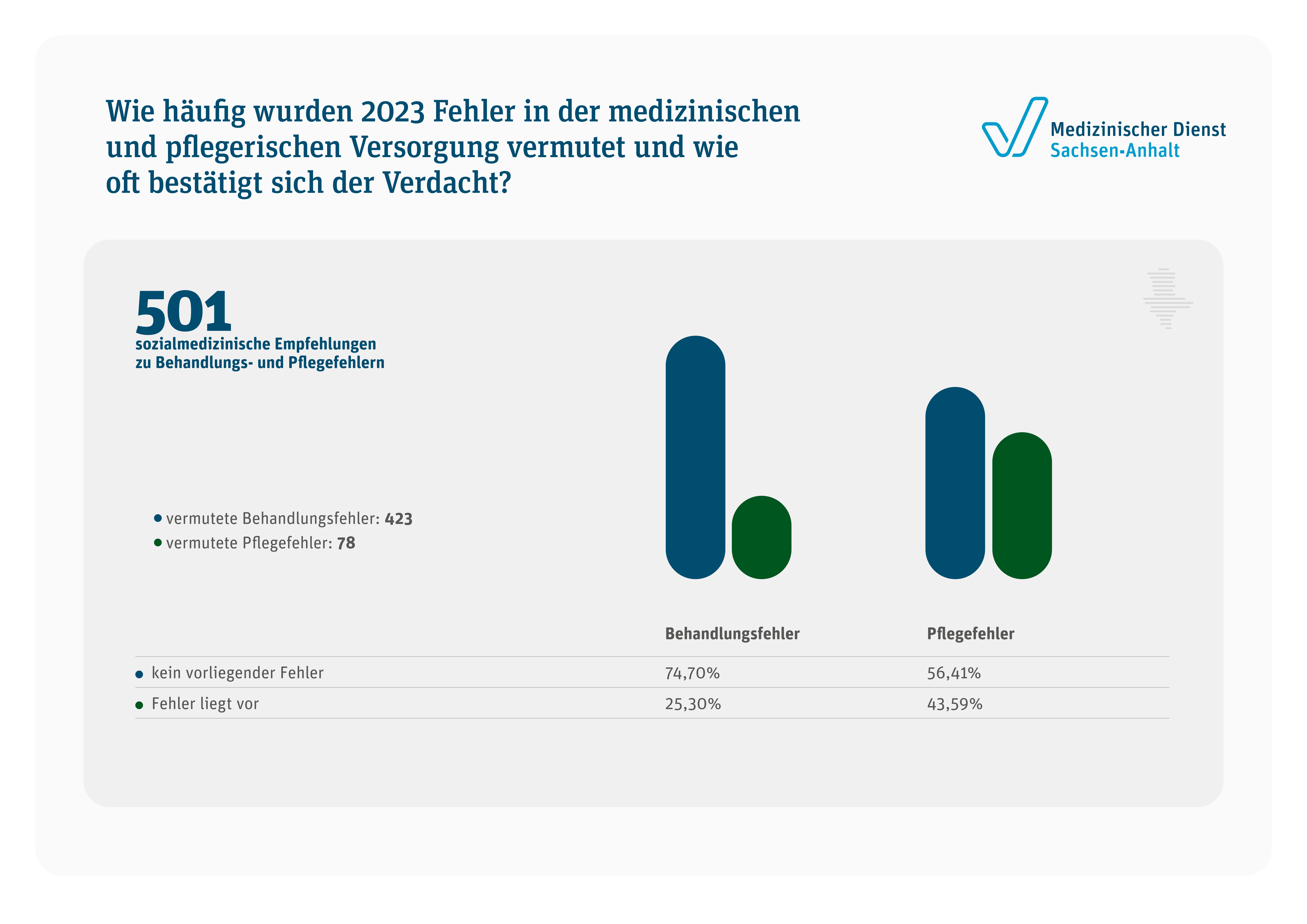 Mit 501 unabhängigen Gutachten unterstützte der Medizinische Dienst Sachsen-Anhalt im Jahr 2023 die Menschen im Land bei vermuteten Behandlungsfehlern in Medizin und Pflege. Bei 360 Einschätzungen (72 %) lag kein Behandlungsfehler vor, bei 141 Aufarbeitungen (28 %) bestätigte sich der ursprüngliche Verdacht. Die Anzahl bestätigter Behandlungsfehler bleibt damit nahezu identisch zum Vorjahr (145 bestätigte Behandlungs- und Pflegefehler in 2022).